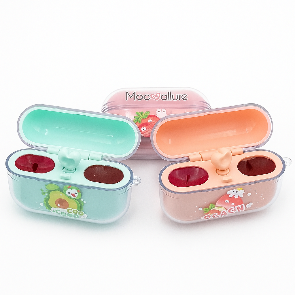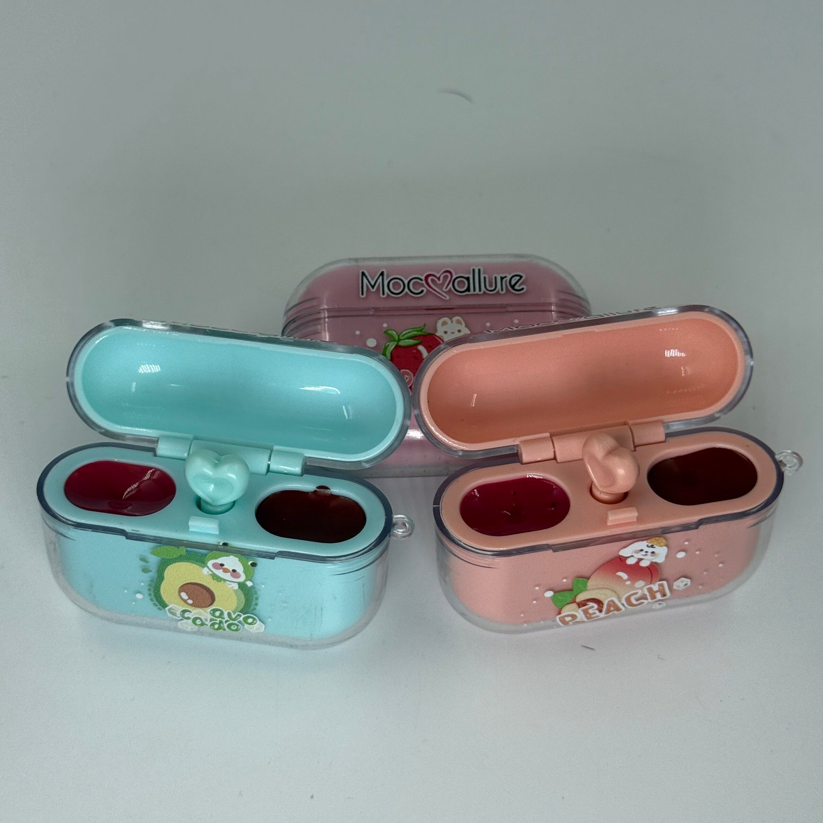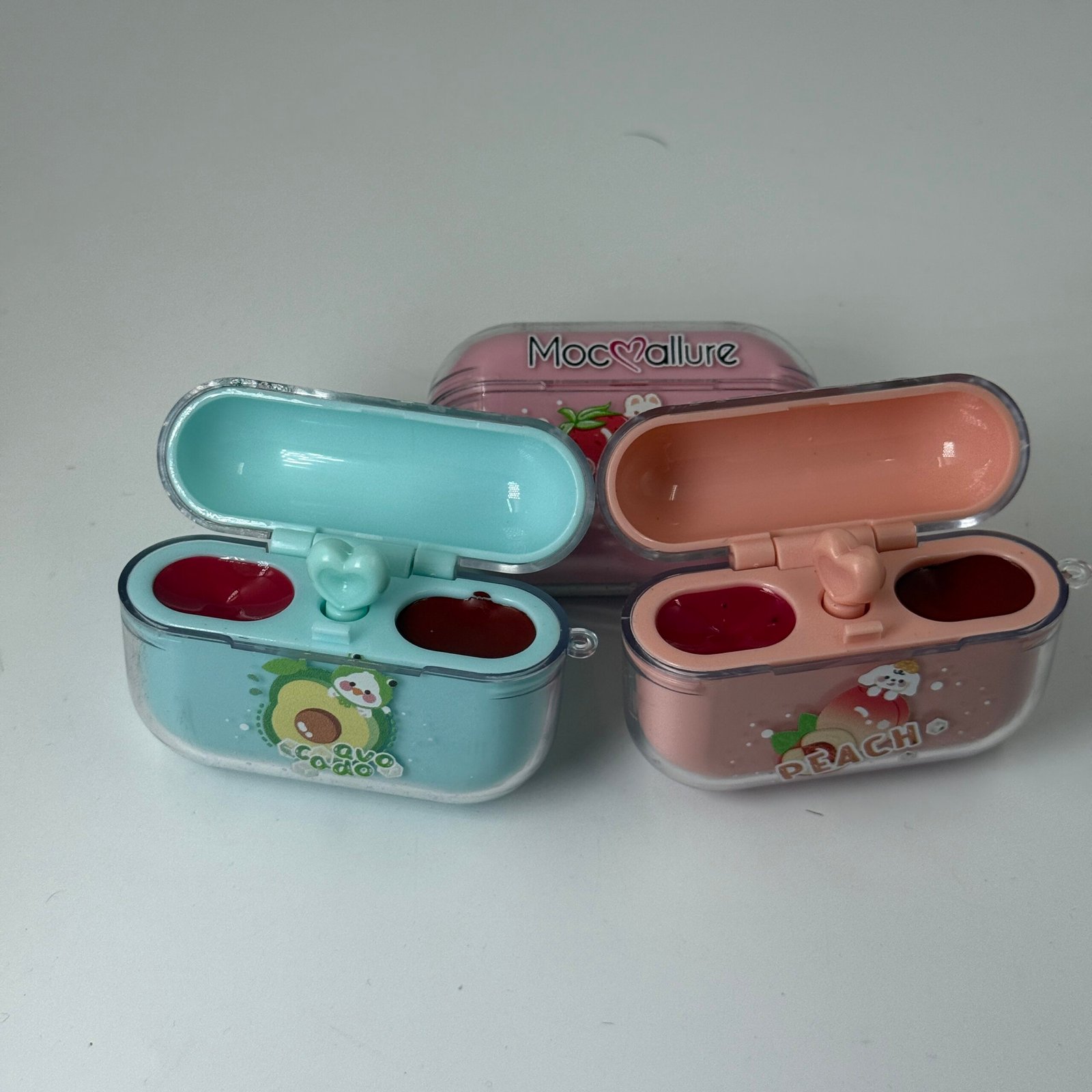 The blue “Avocado” case and the peach “Peach” case each contain two slots, one holding a lip balm and the other a lipstick.