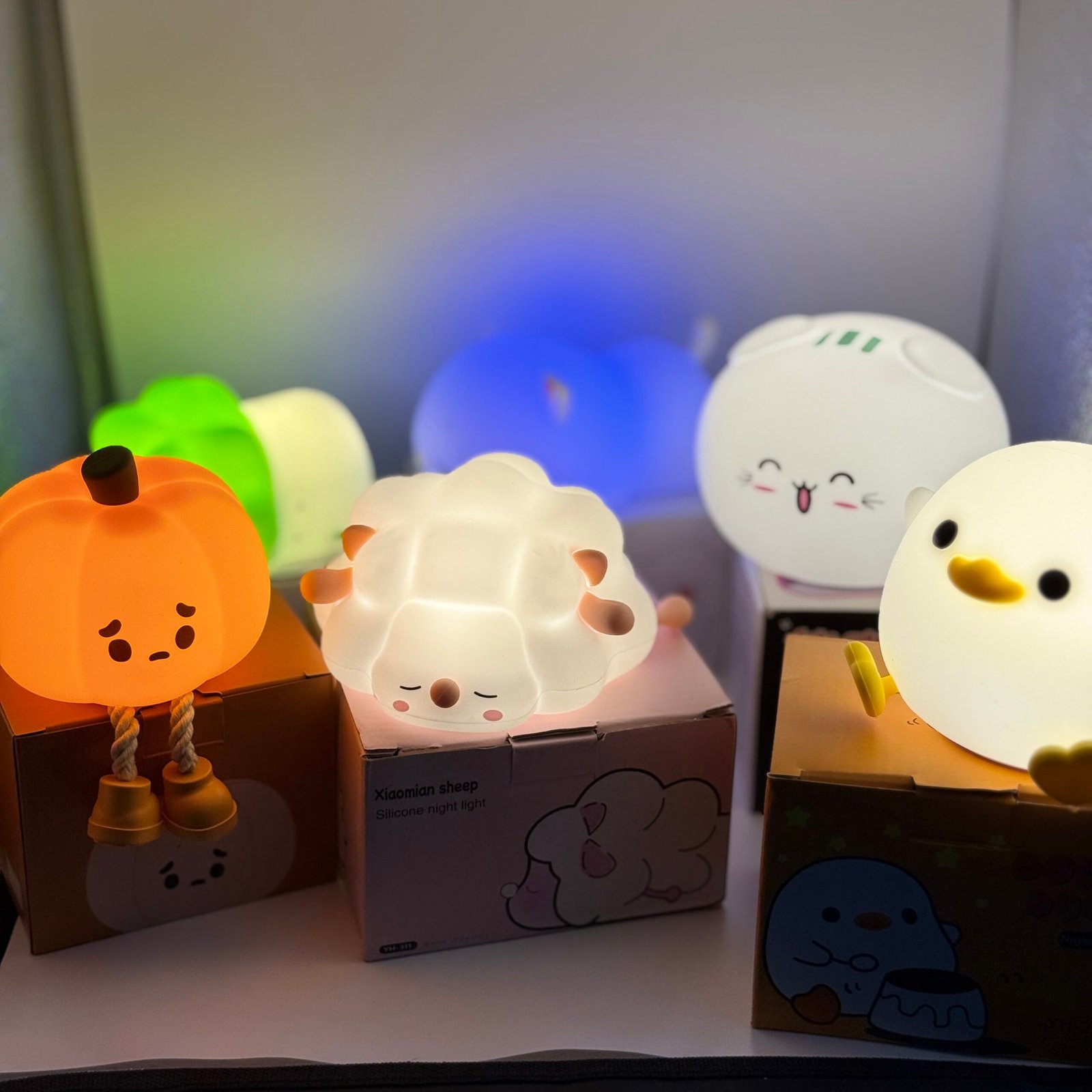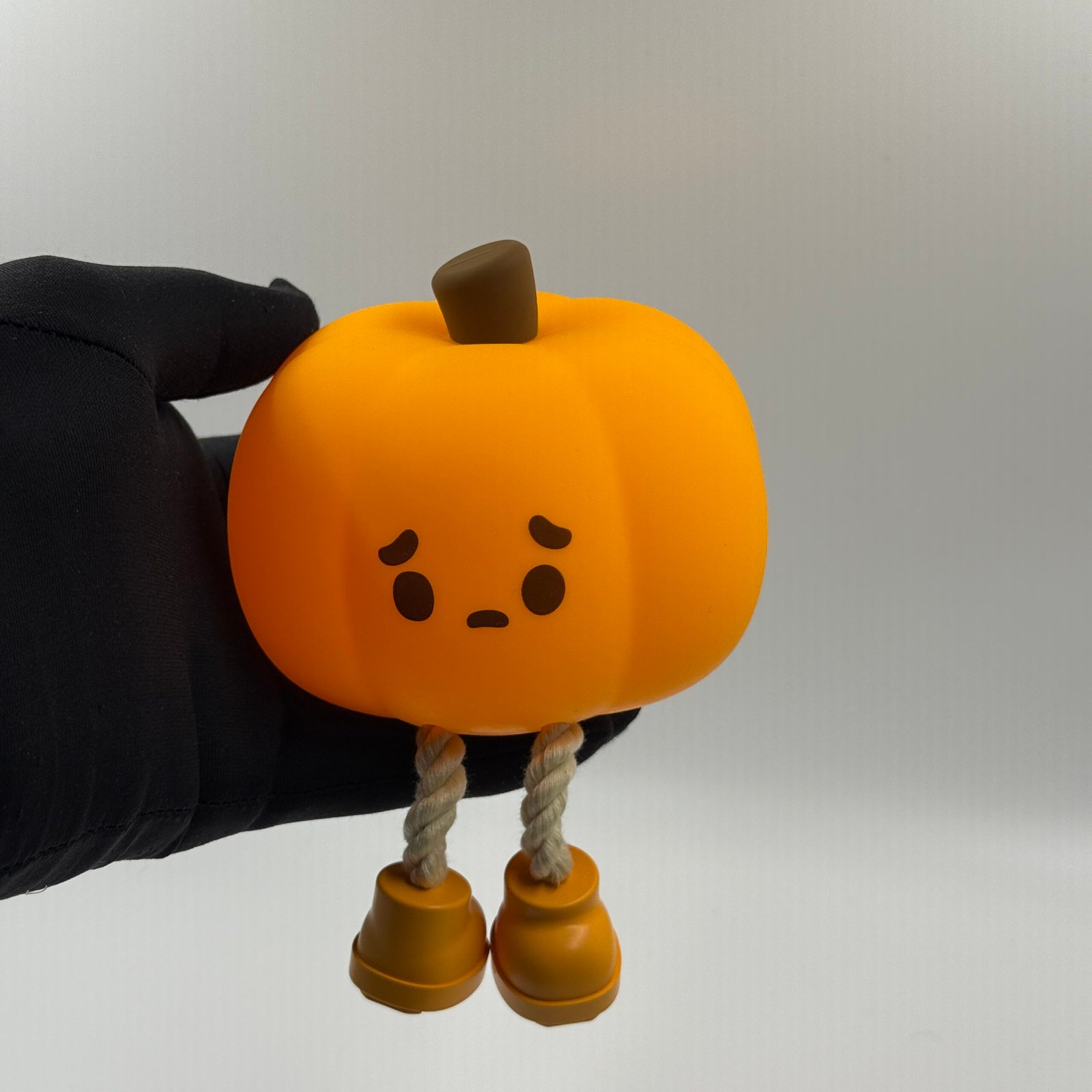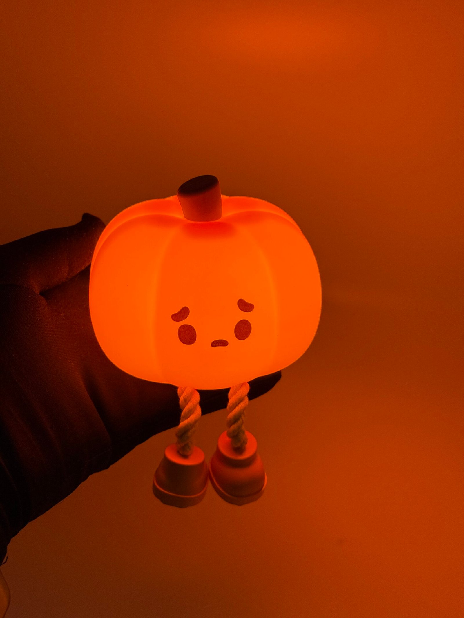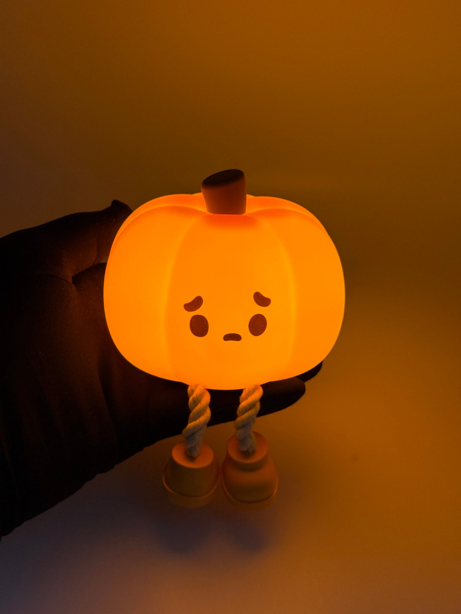 Glowing pumpkin night light with sad face and dangling legs — cute and cozy.